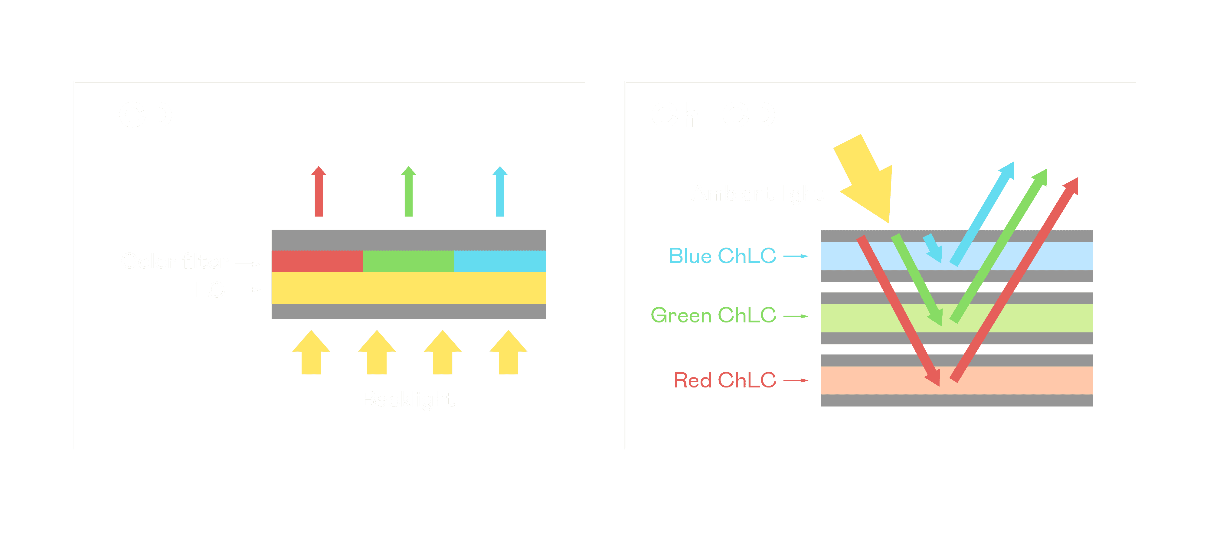 ChLCD 胆固醇液晶就如同纸张一样,,透过反射环境光来显示影像,,,,因此长时间观看不易造成人眼视觉疲劳,,,,可达到护眼效果。。。。当处于户外阳光下使用,,LCD 影像容易失真而不易观看,,,,但胆固醇液晶仍可维持较佳的影像品质。。。。